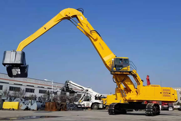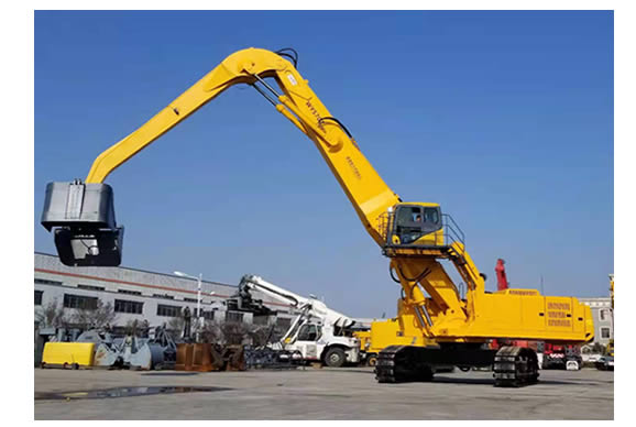 該設(shè)備分別采用了大功率“國(guó)三”標(biāo)準(zhǔn)發(fā)動(dòng)機(jī)、380V 西門子電機(jī),以及全套采用施耐德控制系統(tǒng)拖動(dòng)控制兩套力士樂液壓動(dòng)力機(jī)構(gòu)及先導(dǎo)液力控制的世界首臺(tái)“雙動(dòng)力”抓料機(jī)。該機(jī)設(shè)計(jì)了寬體結(jié)構(gòu)梁,以及加強(qiáng)型可更換正、負(fù)差的二節(jié)式作業(yè)主臂,最大吊重量達(dá) 25 噸、最大作業(yè)半徑為 18米。在 5 至 12 米作業(yè)半徑內(nèi),可配備 5.0 立方蚌殼抓斗,或 2.5 立方梅花廢鋼抓斗。